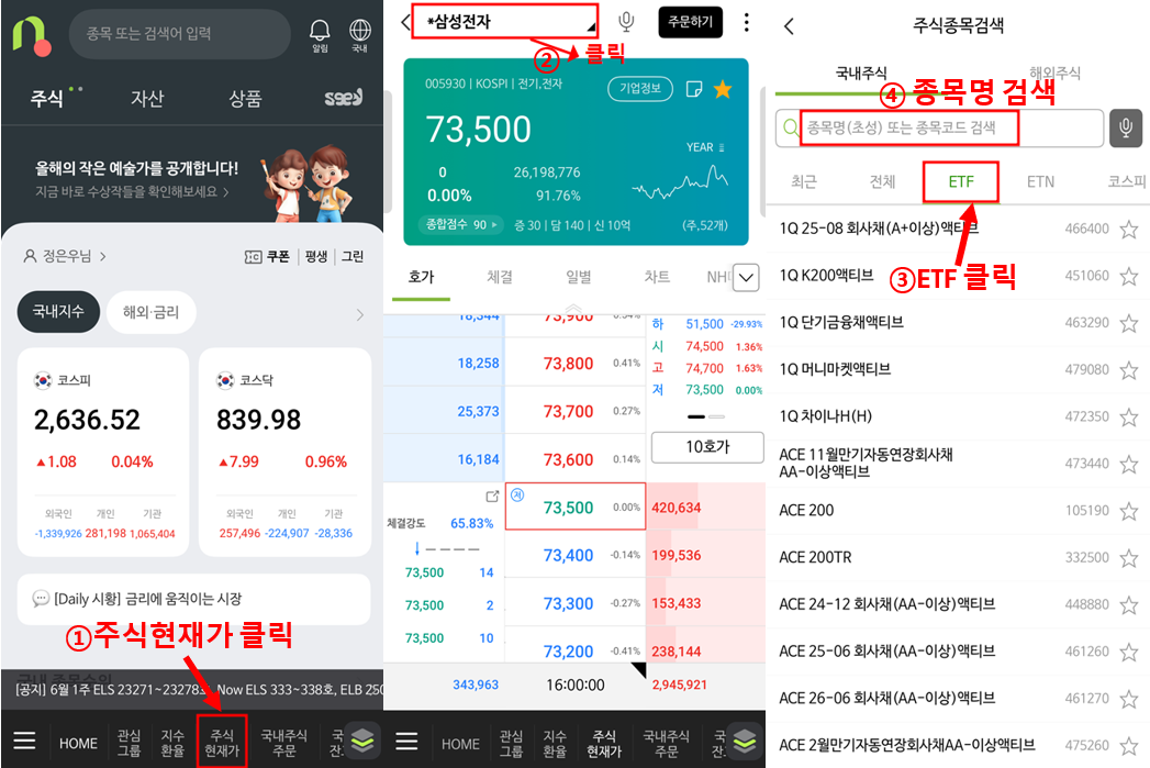 증권사 어플마다 다르지만 보통 아래 사진과 같이 ETF를 검색할 수 있습니다.