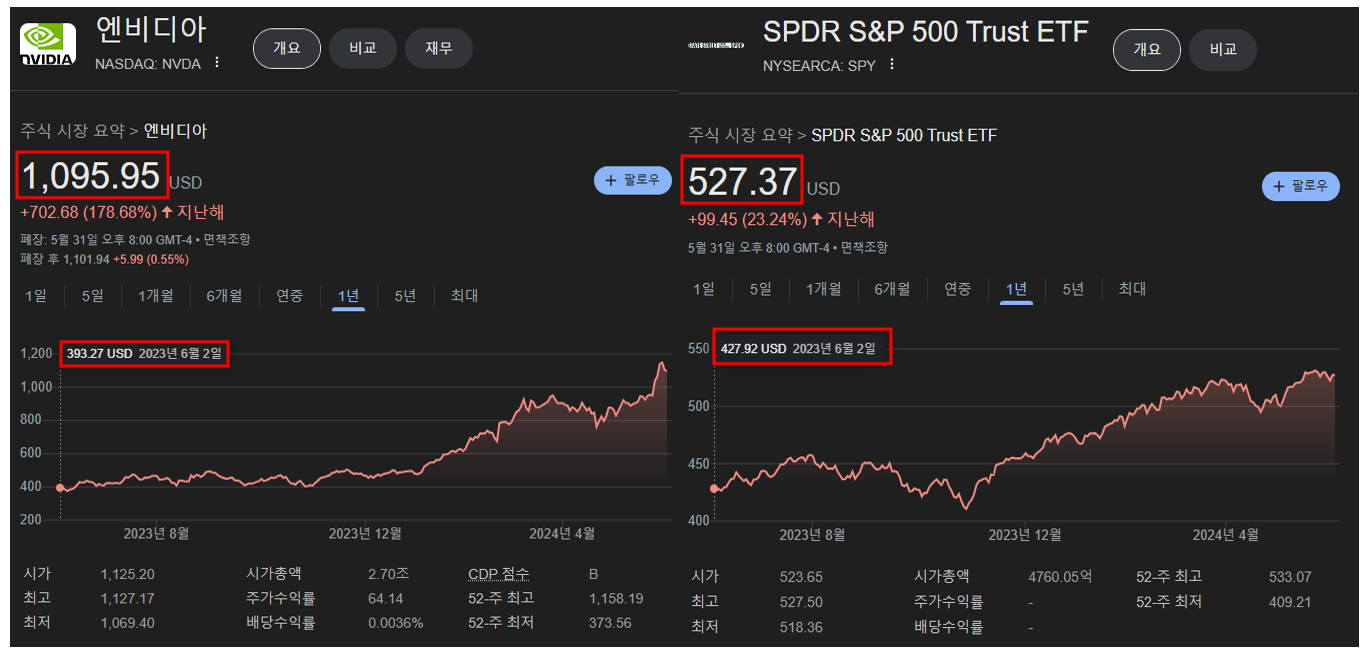 | S&P500 SPY와 엔비디아 (NVDA)를 1년간 투자했을 때 수익률 비교 | |||