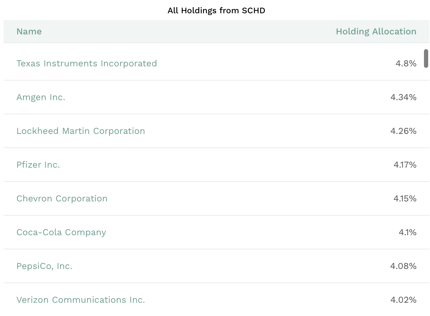 아래 SCHD를 예로 들어보겠습니다. SCHD의 종목구성을 살펴보면 금융, 정보기술, 임의 소비재, 필수소비재 등등 이 있지만 리츠는 포함되어 있지 않습니다. SCHD에 리츠가 없으니 리얼티인컴과 같은 리츠 주식을 여러분의 포트폴리오에 추가 하여 업종을 다각화 할 수 있습니다.
