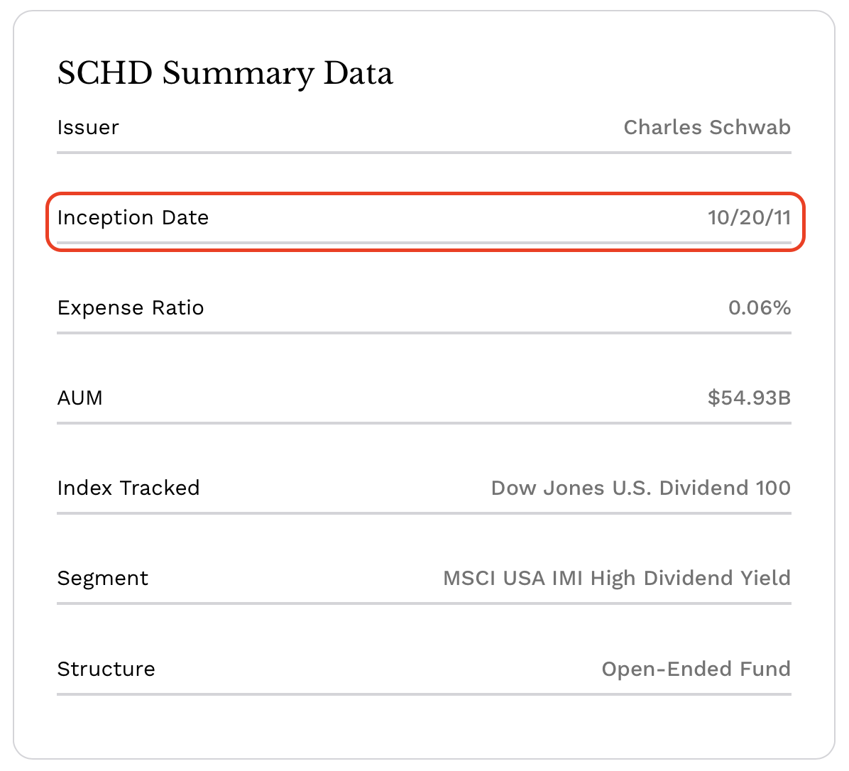 무조건 2008년 금융위기 전, 2000년 닷컴 버블 전 상장한 ETF를 매수하실 필요는 없고 10년 이상이면 충분하다고 생각하고 꾸준히 ETF 정보를 TRACKING 해야합니다. 아래 SCHD가 그 대표적인 예입니다.