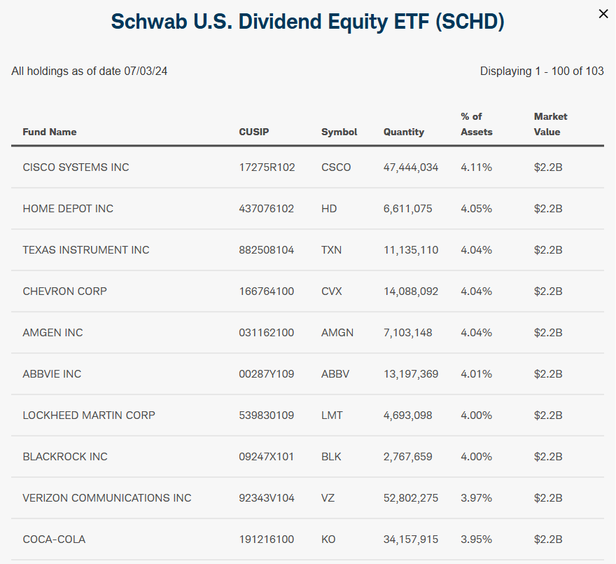 SCHD의 대표적인 기업으로는 CISCO, HOME DEPOT, 암젠(AMGN), 코카콜라(COCA-COLA)등이 있습니다. 정보 기술섹터에서 유명한 브로드컴(AVGO)가 있었으나 24년 3월에 종목이 리밸런싱 되면서 빠졌습니다. 그 이유는 브로드컴의 주가 상승으로 인한 배당률 하락으로 보고 있습니다. SCHD는 10년 연속 배당성장을 한 기업을 편입시키고 있지만 브로드컴의 주가가 상승해 이를 충족시키지 못했기 때문에 바로 빠진 것입니다.
