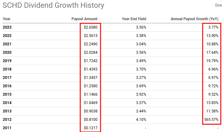 SCHD의 장점은 주가 상승과 배당성장을 동시에 누릴 수 있다는 것입니다. SCHD의 주가는 SPY에 준하는 안정적 주가 상승 뿐 아니라 꾸준한 배당성장을 보여주고 있습니다. 노후준비용으로 알맞은 ETF라 사람들에게 인기가 많습니다.