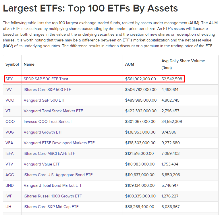 이전 포스팅에서 ETF의 자산총액(시가총액)은 ETF의 안정성을 대변한다고 말씀드린 적이 있습니다. SPY ETF는 미국에 상장되어 있는 ETF 중 가장 자산총액(시가총액)이 큰 ETF입니다. 그만큼 많은 사람들이 믿고 SPY를 매수한다고 할 수 있습니다.