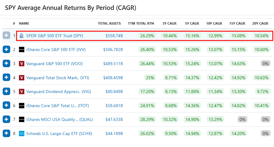 단순 자산총액만 크다고 신뢰할 순 없습니다. 수익률도 좋아야 합니다. 지난 30년간 S&P 500의 연평균 수익률은 10% 이상입니다. 여러분이 SPY에 1억을 넣고 추가 매수 없이, 배당 재투자 없이 20년이 지나면 여러분의 1억이 6억이 됩니다. ETF 중에서 연평균 수익률 10% 이상인 ETF는 드뭅니다. 그러니 어떤 ETF를 매수해야 할지 모르는 투자자 분들은 SPY S&P 500 매수를 고려해 보는 것이 좋습니다.