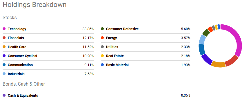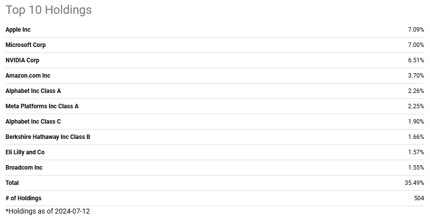 SPY는 기술, 금융, 헬스케어 등등 500개의 기업이 분산투자 되어있긴 하지만 그래도 기술주의 비중 33.86%로 높은 편에 속합니다. 아무래도 AI나 기술 발전의 시대에 살고 있는 만큼 전 세계 경제를 이끌어 나가는 것은 기술주이기 때문에 S&P 500의 상위 비중은 기술주입니다.
